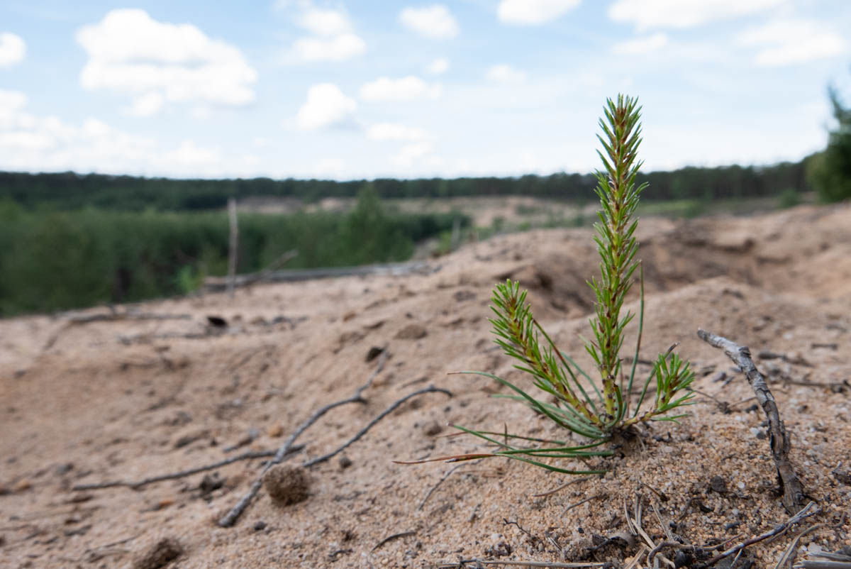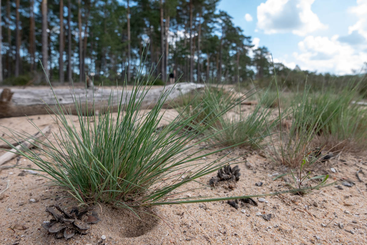 Es ist ein Frühsommervormittag und die Düne gibt sich bereits aufgeheizt. Zwar lockt der feine Sand, die Schuhe auszuziehen und Zehen hineinzubohren. Doch gleichzeitig ist klar, dass das keine besonders clevere Idee wäre. Mit langsamen, schweren Schritten – so ein Gang durch trockenen Sand gleicht ja eher einem Kampf denn einem Spaziergang – folgen wir dem breiten sandgelben Streifen, den zur Linken Bäume säumen und der zur Rechten sanft einige Meter abfällt.