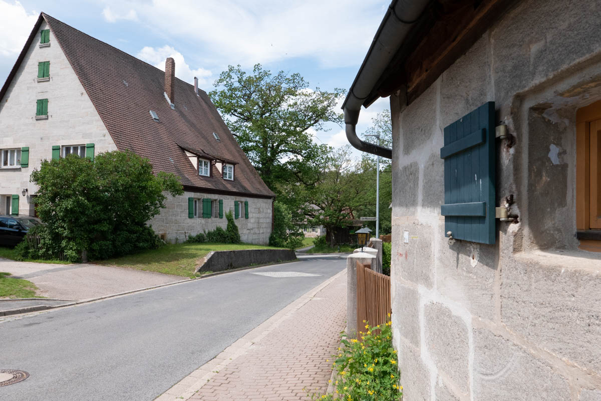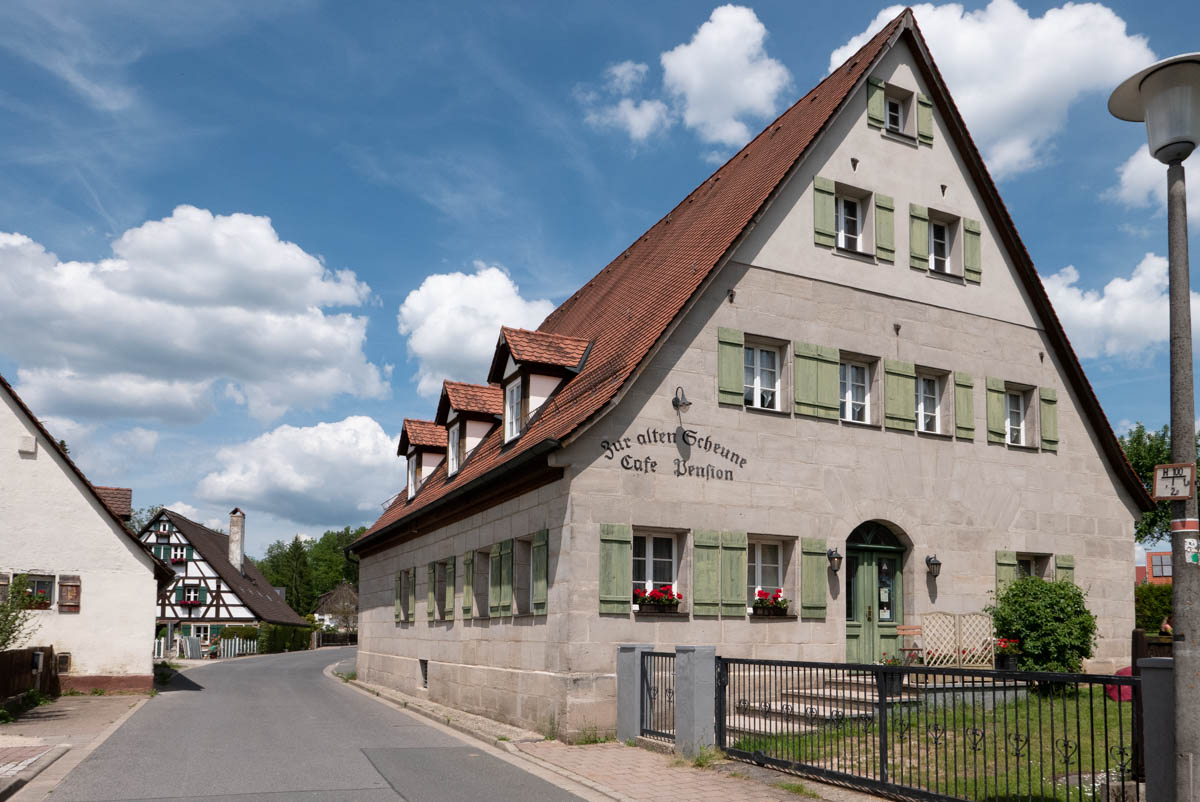 Nachdem wir am Dorfrand von Ungelstetten das Siedlungs-Kunterbunt durchschritten haben, grüßen uns im Dorfkern eben solche Sandsteinhäuser. Eines von ihnen, das Café „Zur alten Scheune“, lockt uns mit seinem Garten – und einer Kuchentheke, für deren riesige Auswahl wir glatt vergessen, dass eigentlich erst einmal die Uhrzeit für etwas Herzhaftes wäre.