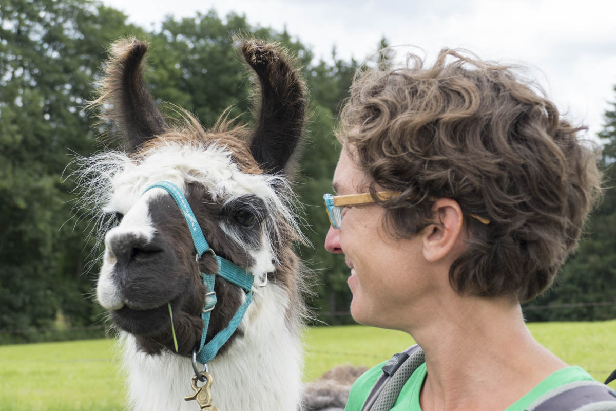 Wobei der andere Fall zumindest im Sommer viel wahrscheinlicher ist: Am liebsten würden die Tiere immer wieder eine Pause einlegen, um an einem saftigen Strauch oder am frischen Klee zu zupfen. Weshalb Regel Nummer drei ins Spiel kommt: die Tiere so führen, dass sie bis zur gemeinsamen Rast möglichst nirgends naschen. So ganz vermeiden lässt sich das oft doch nicht. Mitunter heißt es dann, sich den Dingen zu fügen und gemeinsam mit den Lamajungs stehen zu bleiben.