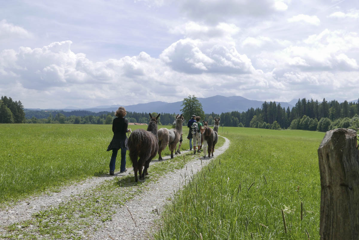 Alpakas statt Lamas: Gerade, wenn (kleinere) Kinder dabei sind, ist es eine Überlegung wert, statt mit Lamas mit Alpakas zu wandern. Allein schon wegen der Größe ist es für Kinder mitunter einfacher, selbst ein Tier zu führen. Einen ganz besonderer Alpaka-Trupp ist übrigens westlich von München, an der Weilachmühle, daheim.
