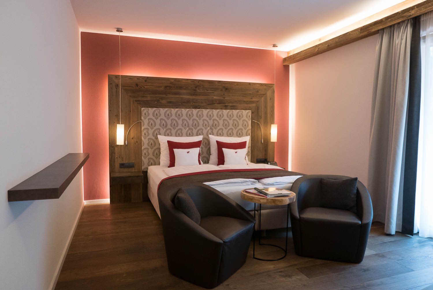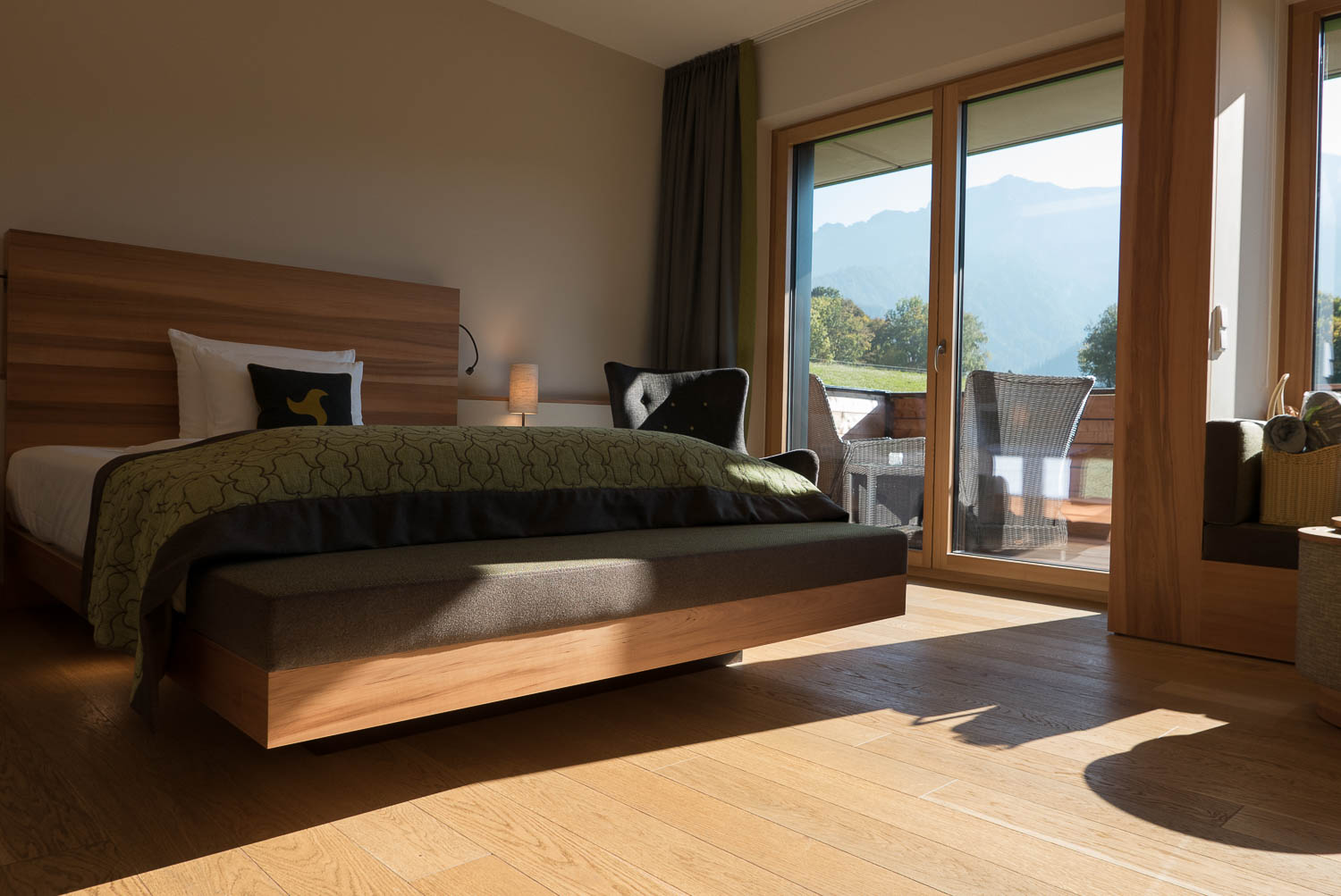 Bevor’s allerdings auf den Predigtstuhl geht, gibt’s kein Vorbei am Frühstücksbüffet. Oder doch erst eine Runde schwimmen? Vielleicht auch einfach nochmal zurück ins Bett? Auch später am Tag will noch die eine oder andere Orts-Wahl getroffen werden: Mit dem aktuellen Lieblingsbuch könnte man sich beispielsweise einfach auf Auszeit-immer und -ewig in die Sitzecke vor dem großen Fenster sinken lassen. Oder doch food for the mind im behaglichem Ambiente der Bibliothek, in der immer wieder auch allerlei Kulturelles für Hotelgäste und Einheimische organisiert wird? Oder eine Weile in die Sauna?
