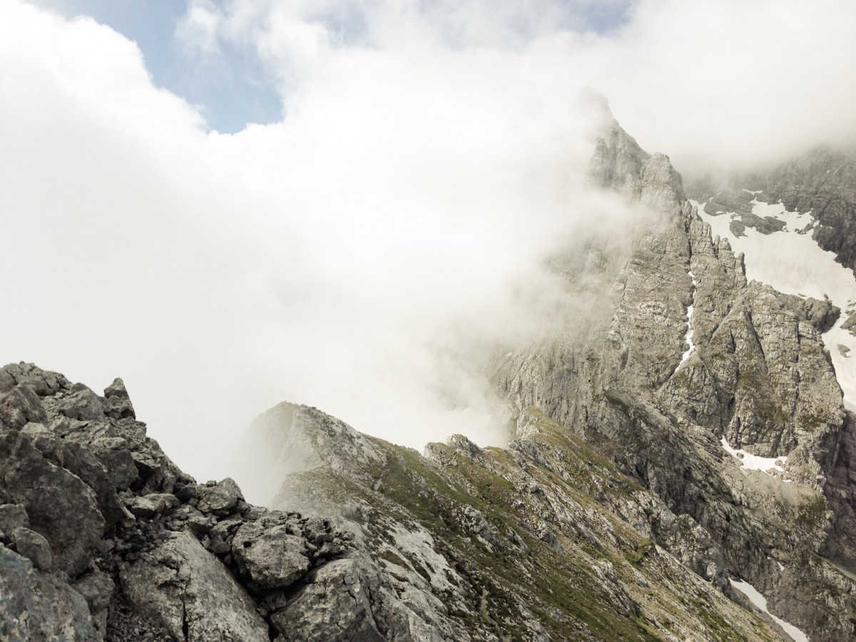 Abstieg von der Schärtenspitze entweder zurück zur Hütte oder über die Eisbodenscharte: Für letztere Variante zunächst einige Meter zurück vom Gipfel absteigen und weiter geradeaus. Die Steigspuren führen direkt am Grat entlang, oder leicht rechts versetzt. Teils seilversichert und immer wieder mit Tiefblicken. An der Eisbodenscharte geht es steil in eine Rinne hinein (seilversichert, bis sich die Rinne weitet und später allmählich erst in Blockwerk übergeht und dann in einer grünen Hochfläche endet. Bis zur Hochalm – von dort kann die Runde Richtung Wimbachgries, Ramsau oder (die Runde schließend) zur Schärtenalm und hinab nach Hintersee beendet werden.