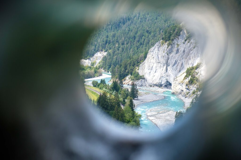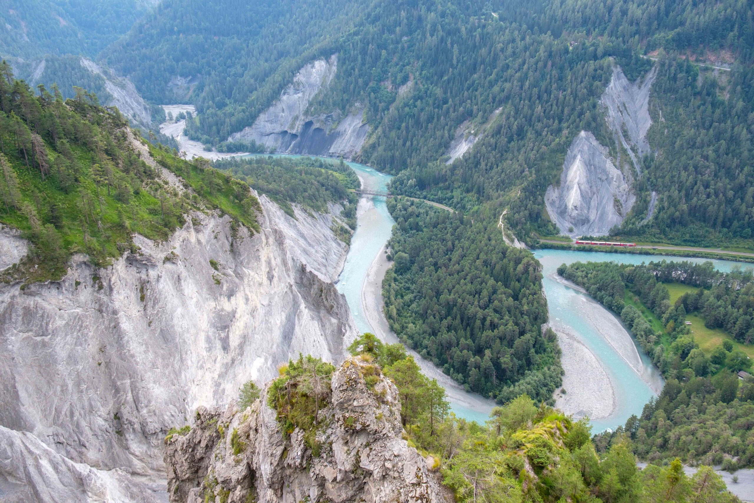 Von der Aussichtsplattform, die der Gestalt eines Mauerseglers nachempfunden ist, wirkte die Rheinschlucht auf mich wie ein Miniatur Wunderland: Klitzeklein ein roter Zug der Rhätischen Bahn, der sich gleich neben dem Fluss durch die hohen, hellen, bis mehr als dreihundert Meter steil abfallenden Schuttklippen schlängelt.