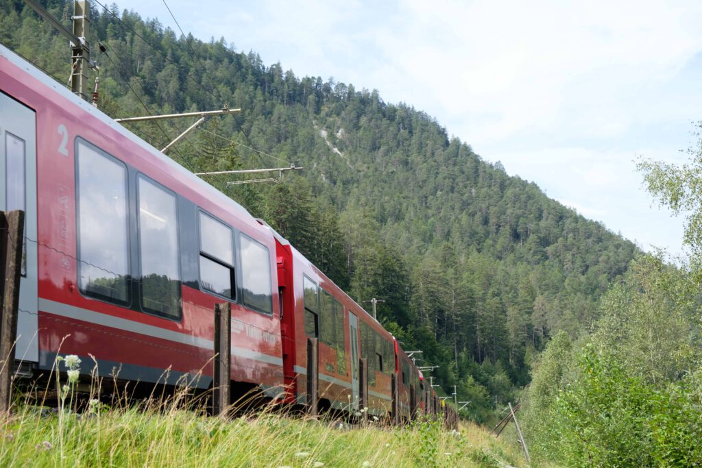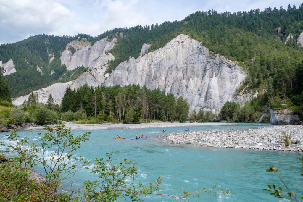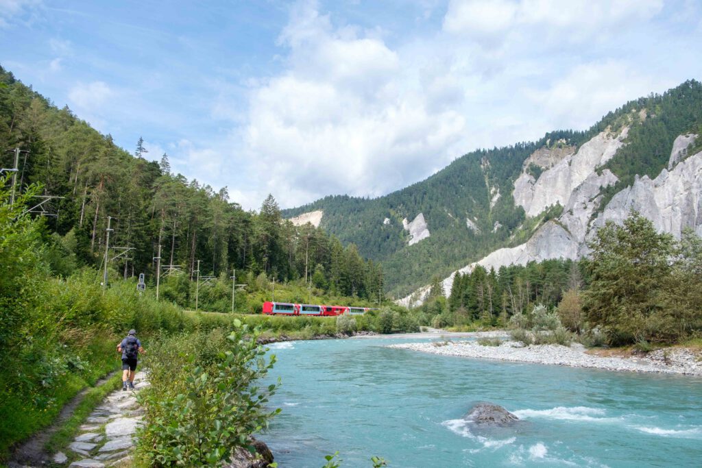 Der Fluss rauscht schnell durch die kurvenreiche Schlucht, immer wieder trägt er Kanu- und Rafting-Gruppen auf seinen Wellen. Schneller und lauter rauscht nur der nächste Zug heran. Auf der eingleisigen Strecke, die seit mehr als 120 Jahren durch die Rheinschlucht führt, ist einiges los. Neben manch einem Güterzug und der regulären Regionalbahn schlängelt sich auch ein historischer Zug mit vier Pullmanwagen durch die Schlucht, ebenso wie der moderne Glacier Express mit seinen großen Panoramascheiben.