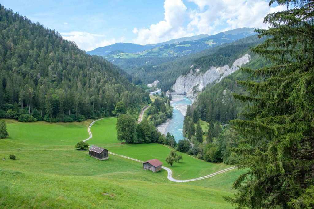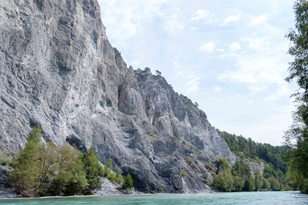 Was für eine spektakuläre Landschaft! Entstanden ist sie, nachdem sich die eiszeitlichen Gletscher zurückgezogen hatten und es vor mehr als 9000 Jahren zu einem gewaltigen Bergsturz kam, bei dem das Tal verschüttet wurde. Mit der Zeit arbeitete sich das Wasser seinen Weg durch die lockeren Schuttmassen und die Rheinschlucht war geformt.