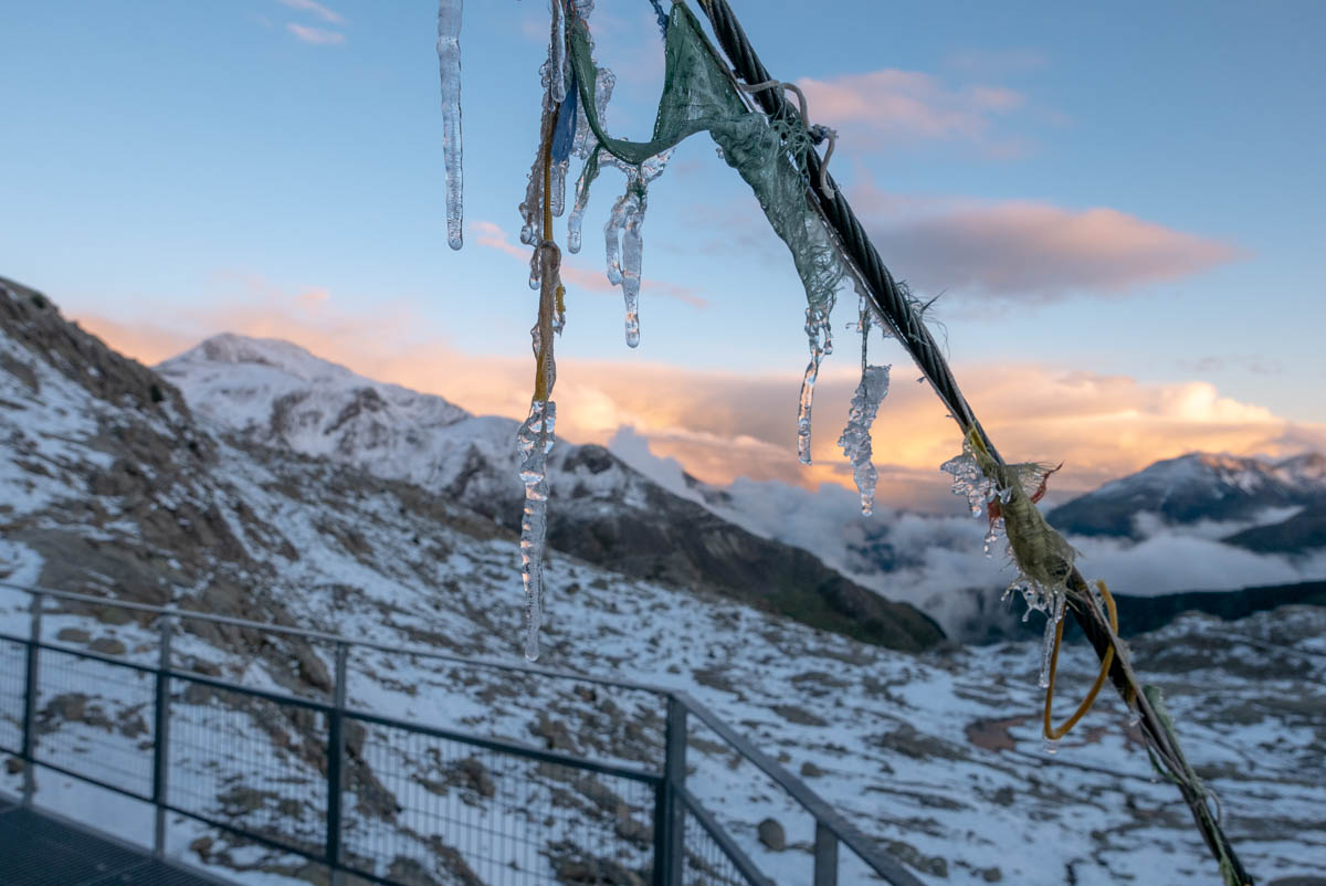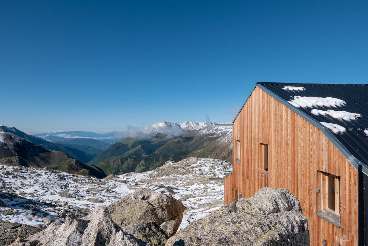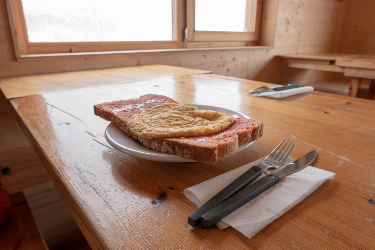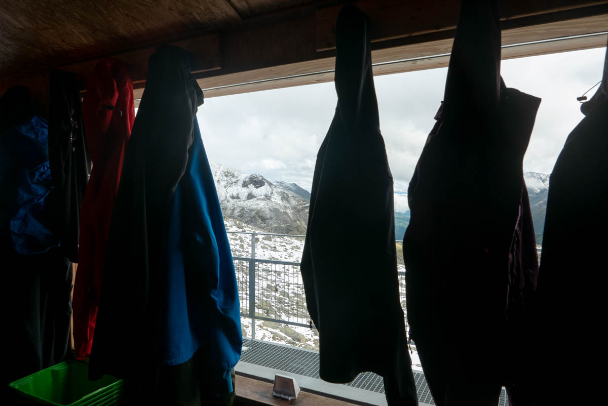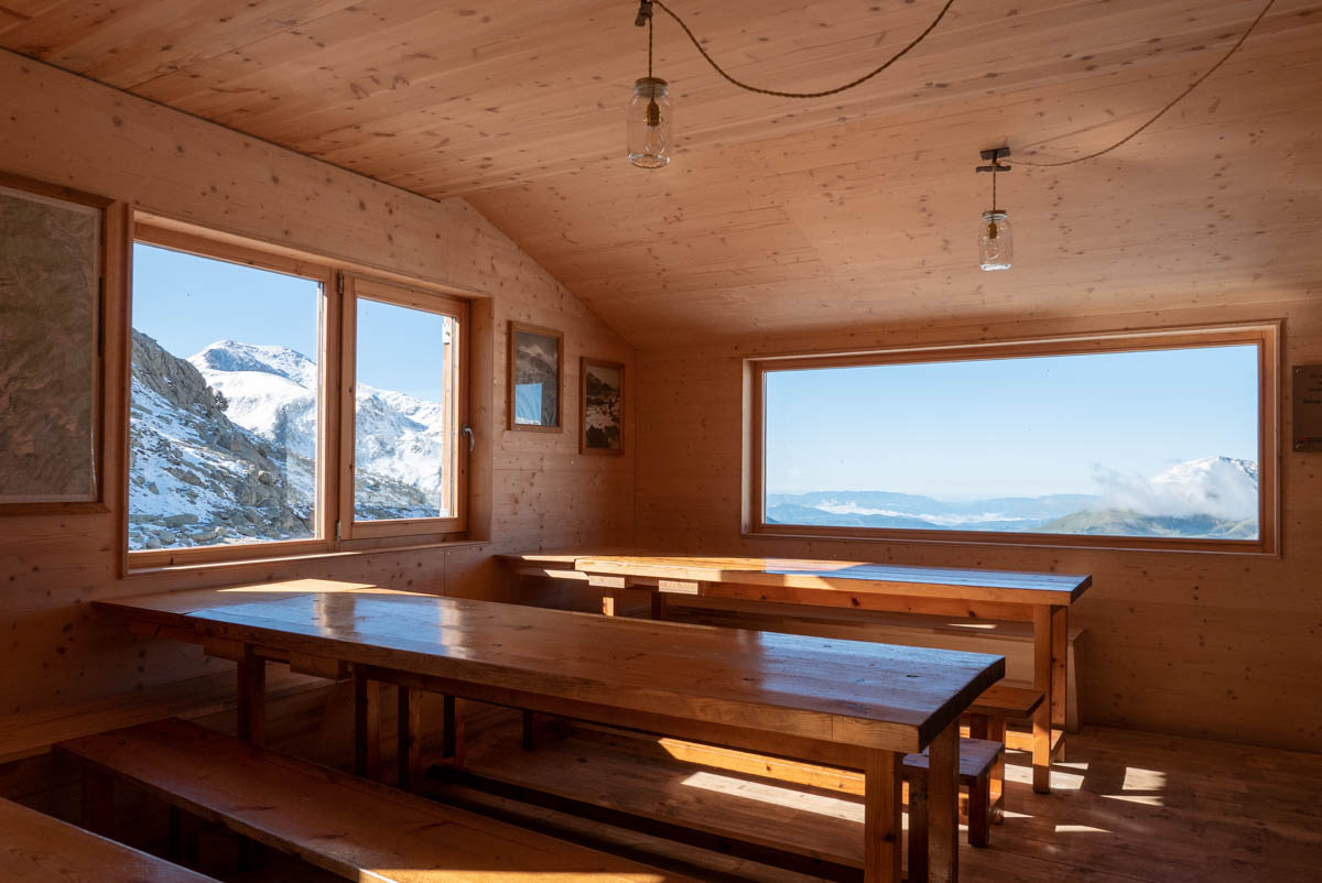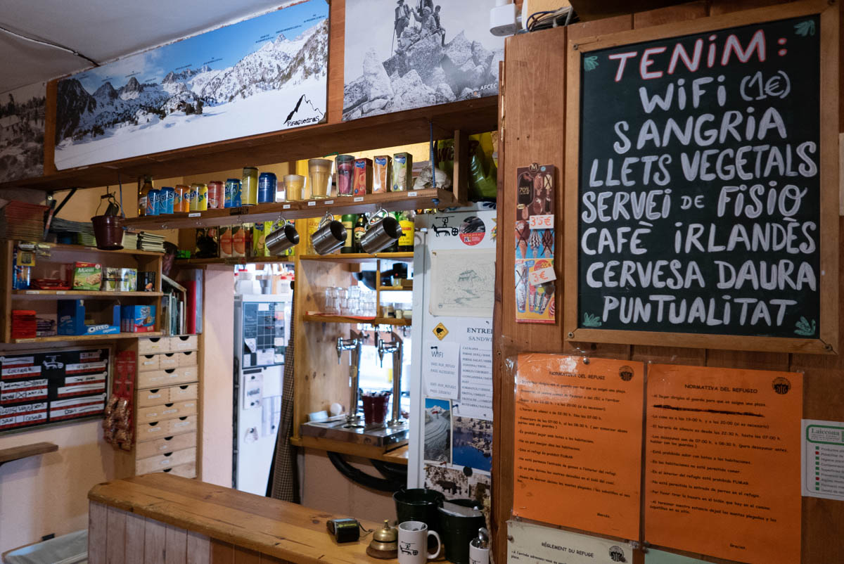 Am frühen Nachmittag treffen wir auf dem Refugi de Colomina ein. Schnell ist klar, dass diese Hütte gut und gerne schon jetzt meine Lieblingshütte auf dieser Wanderung sein würde. Die bollernde Wärme des kleinen Gaskamins kommt mehr als recht nach den Stunden in der Kälte. Dazu noch ein großzügiges Lager, das erst vor kurzem erneuert wurde, ein sympathisches Pächterpaar und riesige Fenster. Ein paar Stunden stiebt an den Panoramascheiben noch der Schnee vorbei. Dann legt sich der Wind, die Wolken heben sich und zum ersten Mal sehen wir, wo wir heute sind. Die Begeisterung fürs Panorama überbietet fast noch die Freude über das Abendessen.