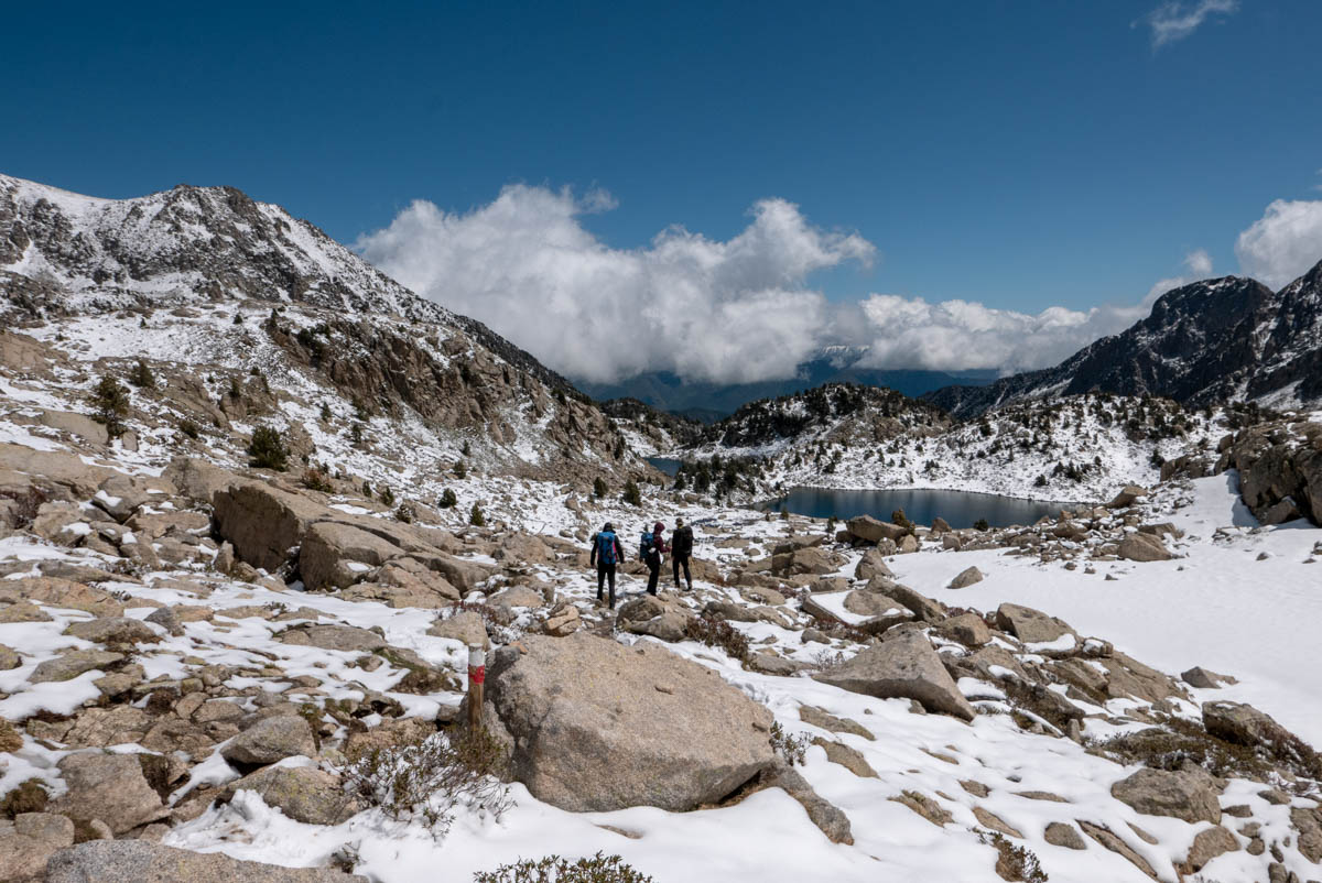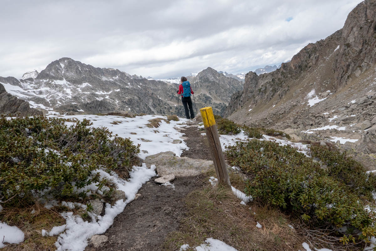 Inzwischen hatte sich ein Gefühl der Zuversicht breitgemacht. Der Pfad war trotz Schnee gut zu finden. Selbst im Blockwerk ging es mit Bedacht gut voran. Laut Karte würde sich das Gelände nun abflachen und über den Pass am Collada de Dellui auf gut 2.500m führen. Kurz unterhalb dieser höchsten Etappenstelle trafen wir auf ein niederländisches Pärchen.