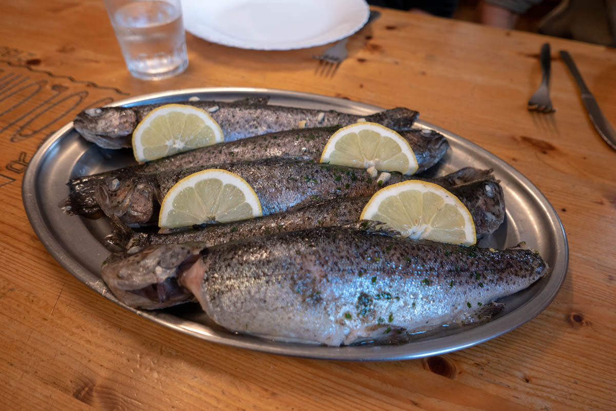 Das gemeinsame Essen lernen wir als ein wunderbar entspannendes Phänomen der katalanischen Hütten kennen: beim Tischdecken hilft jeder ein wenig, bevor es ein dreigängiges Menü gibt. Jeder nimmt sich dazu von den Tabletts und aus den Schüsseln und Terrinen, die groß und schwer auf den Tisch kommen. Suppen und Salate, botifarra (eine Art frische Bratwurst, die gekocht oder gebraten wird) werden so während unserer Wanderung aufgefahren, genauso wie Forellen oder Schweinebacken. Es geht so regionaltypisch schmackhaft wie deftig zu, doch auch die Vegetarier unter uns verhungern nicht.
