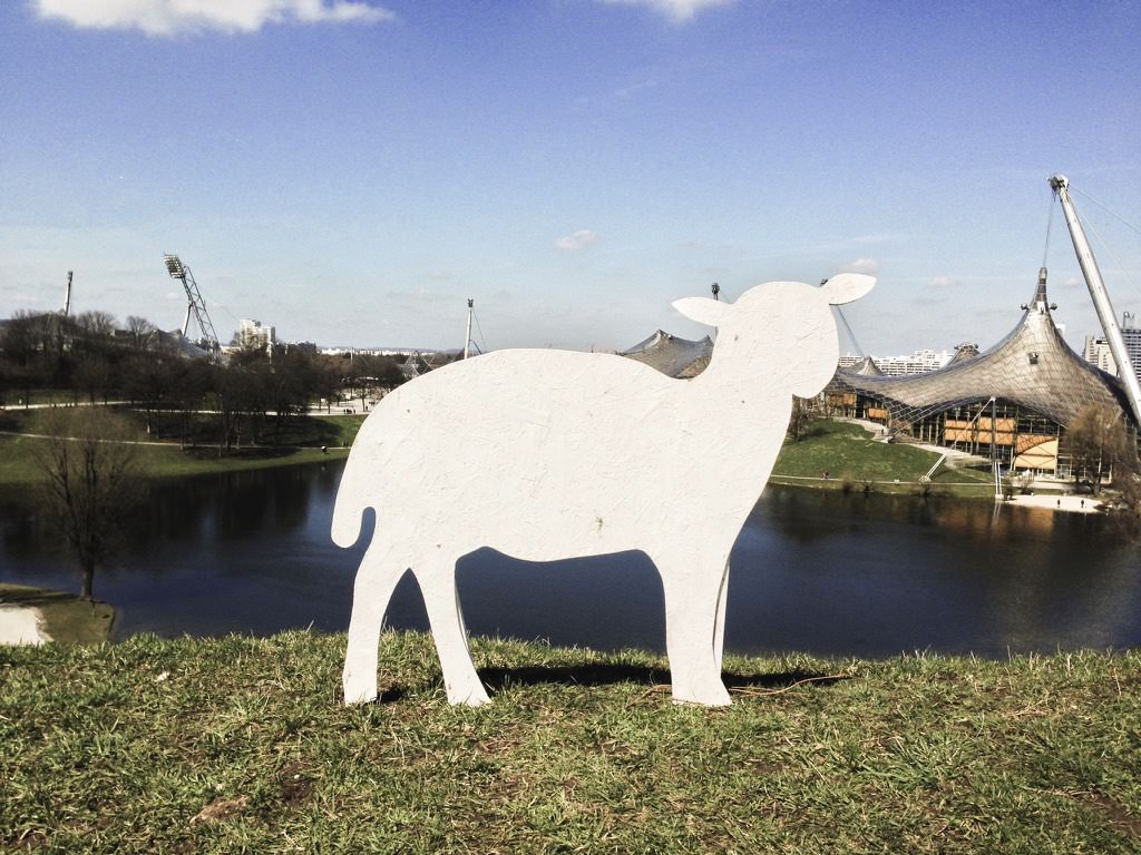 So erlebt beim Kunstprojekt „Urbane Transhumanz“ von Walter Kuhn, das derzeit im Münchner Olympiapark anzuschauen ist: Am Olympiaberg steht noch mindestens bis zum 12. April 2015 eine rund 60 Tiere umfassende Schafherde. Gefertigt aus etwa ein Zentimeter dicken Pressspanplatten. Weiß, rot und schwarz lackiert.